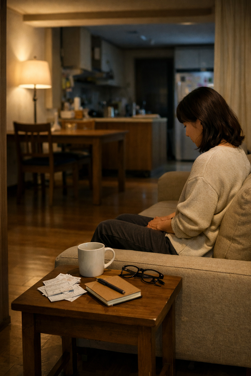 거실에서 미뤄둔 영수증과 노트를 정리하는 장면
