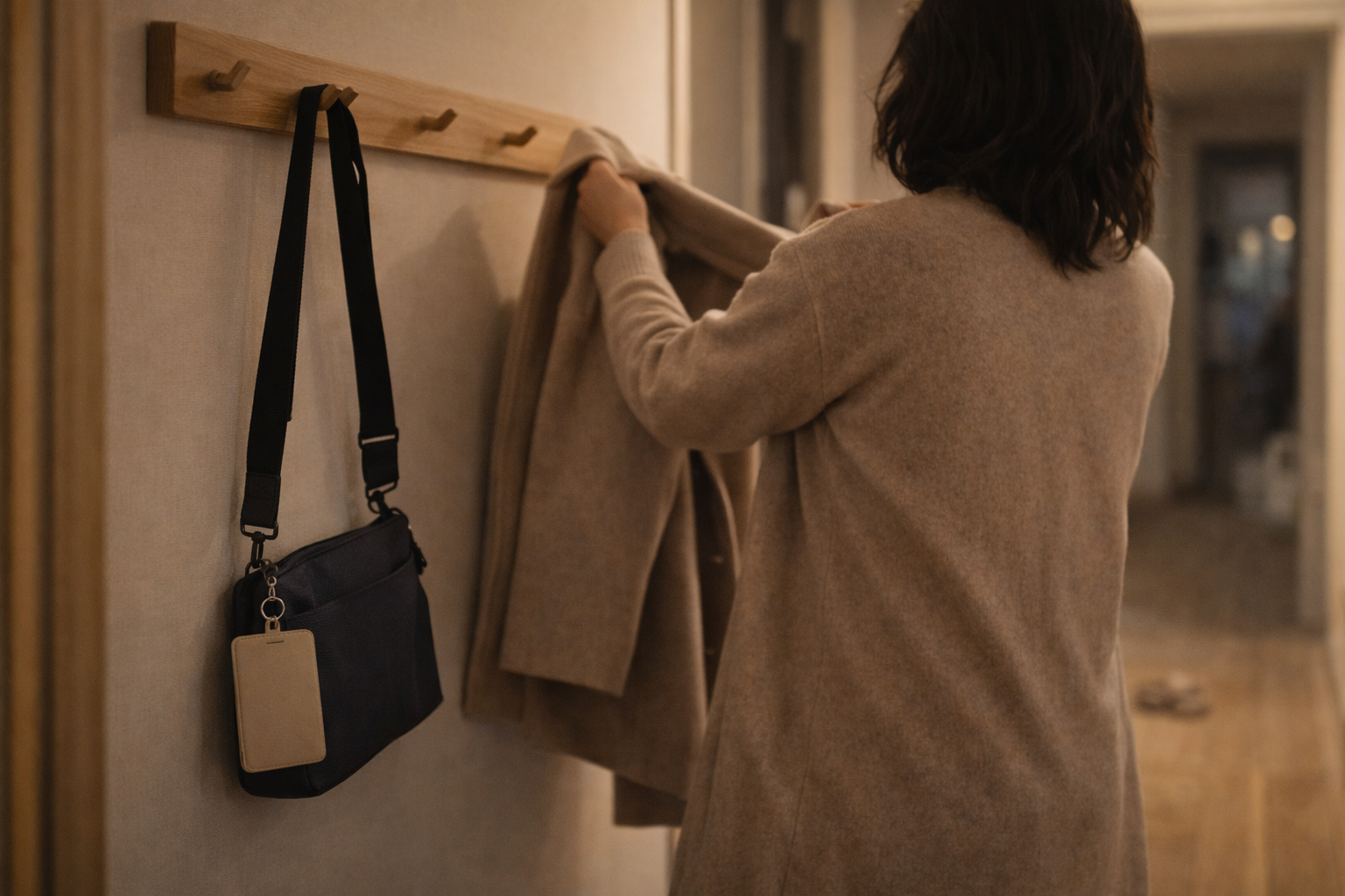 겨울 저녁 실내에서 가방과 외투를 정리하며 귀가하는 장면