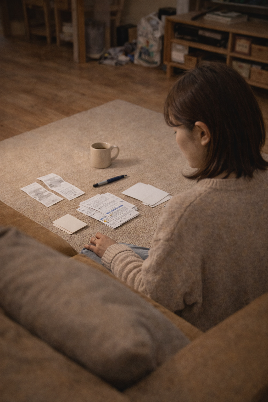 거실 바닥에서 월말 지출 내역을 다시 보는 장면