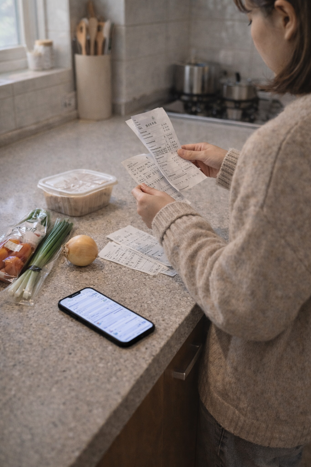 주방 조리대에서 장보기와 지출 내역을 함께 보는 장면